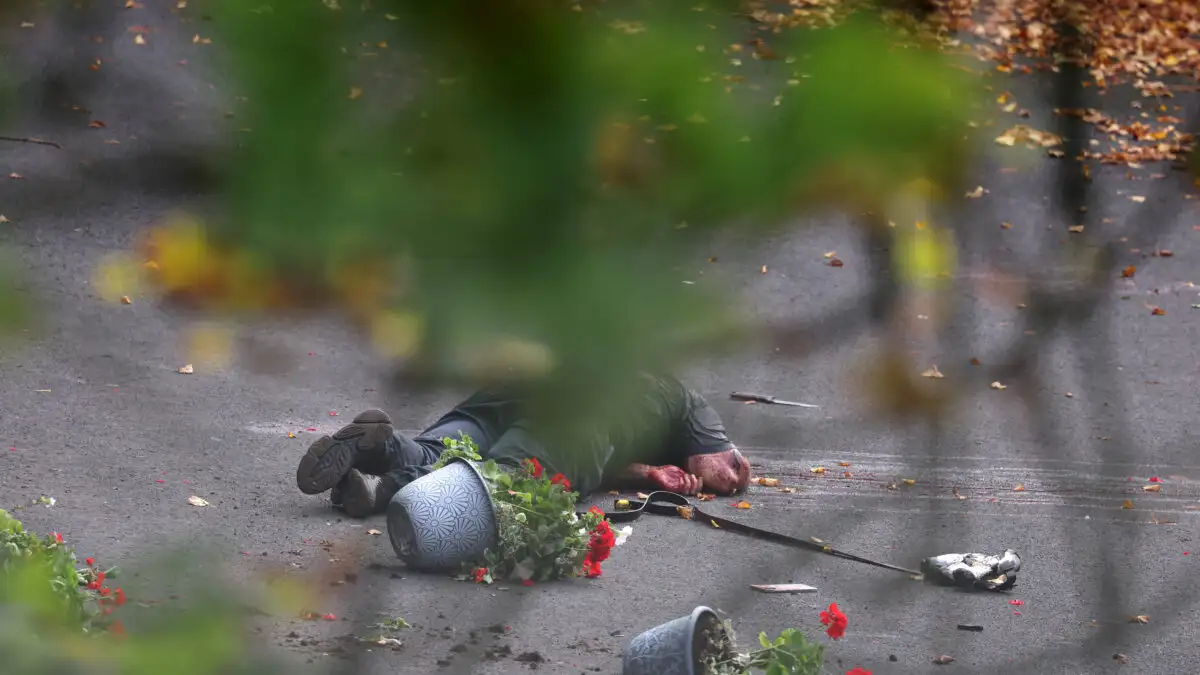 Εικόνες του Reuters δείχνουν τον ύποπτο πεσμένο στο έδαφος, αιμόφυρτο, με ένα μαχαίρι μπροστά του.